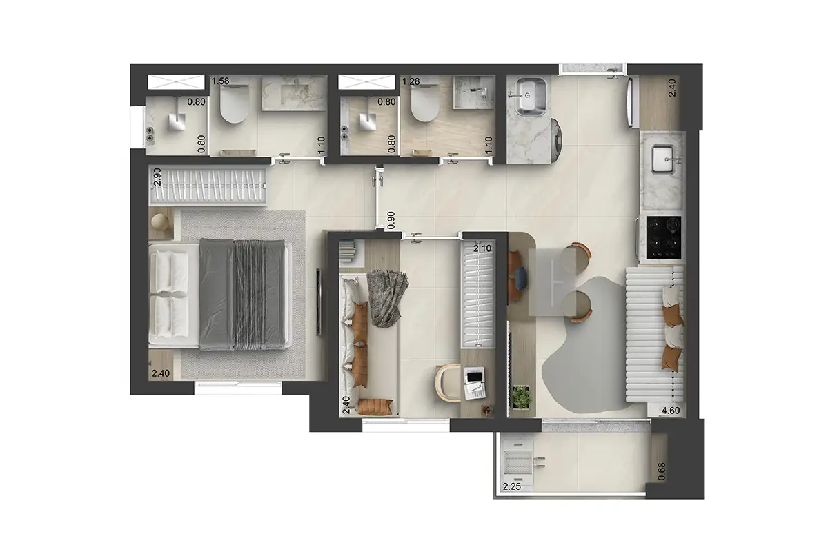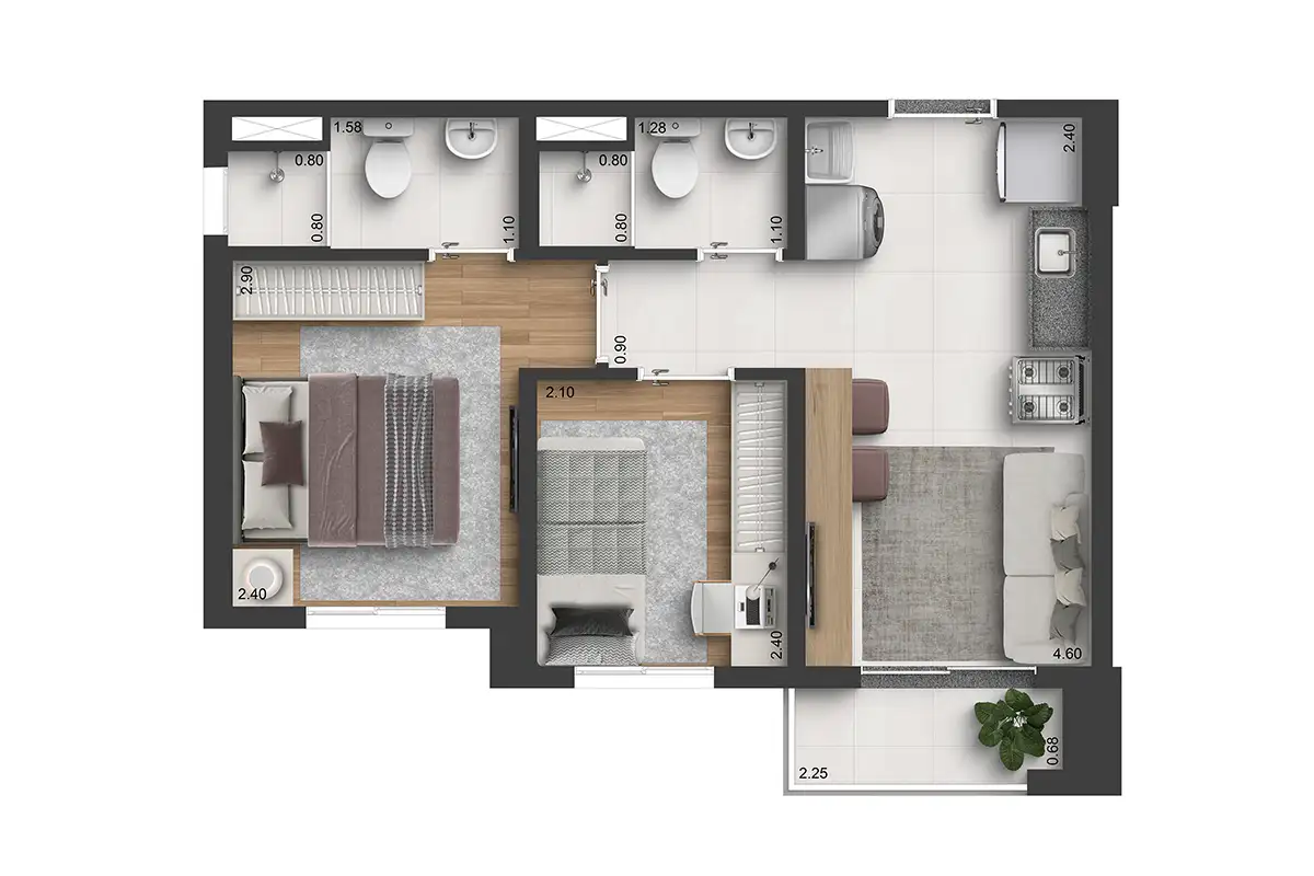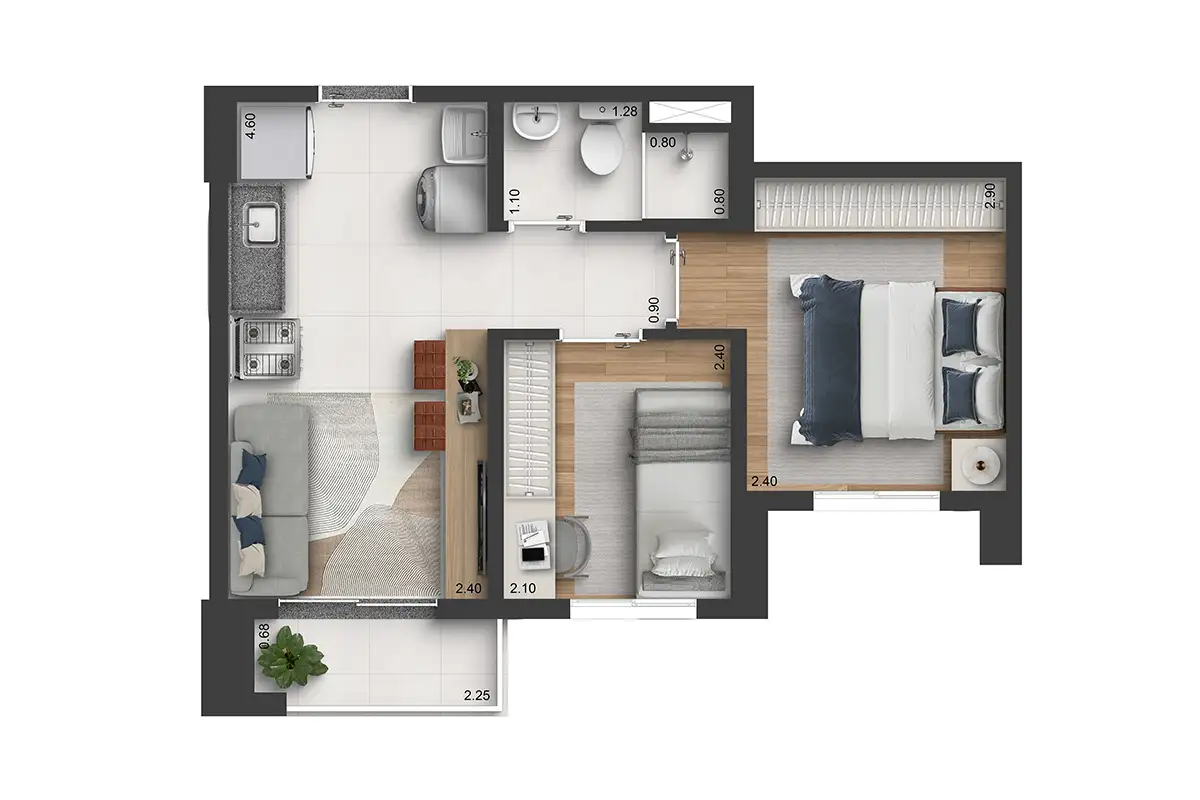 ☑ 2 dorms., com suíte e varanda | 37m²